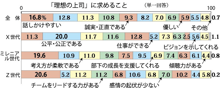 理想の上司に求めることを聞いたところ「話しかけやすい」が16.8%で最も多かった。「話しかけやすい」がZ世代とミレニアル世代ではトップだったが、X世代では「公平・公正である」がトップだった。