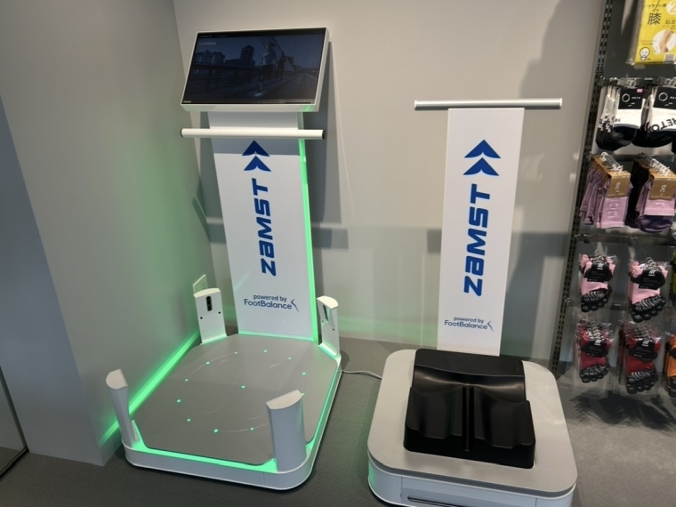 1号店は2層で売り場面積約130平方メートル。シューズ20ブランド、アパレル20ブランドを揃える。乗るだけで足の形を測定して靴選びに生かせる機械もある。