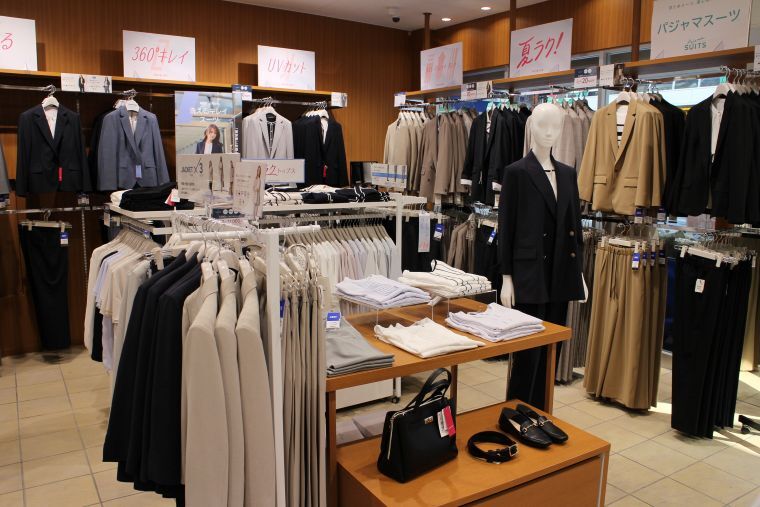 入社4年目の小長根佑衣さんは、今年2月から新店の北千住駅西口店で副店長として働く。AOKIは都内の駅前などの好立地に戦略的に出店を強化しており、同店は通常よりも小型のプロトタイプ店。狭小店だがEC「イージーウェブショップ」と連携しつつ、丁寧な接客などリアルな強みを生かした新たな売り場作りを目指す。
