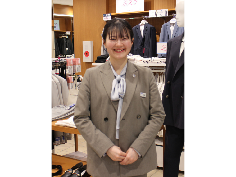 販売現場でのやりがいは「オンラインでの購入が増大する中、成人式や就職活動、入社など客の人生に寄り添い、リアルな場でしっかり話を聞き、悩み事の解決に役立てること」だと考えている。最近は、仕事でスーツを着用しない人も増え、逆に「オフィスカジュアルやスマートスタイルって何ですか」とよく尋ねられるという。そうした疑問に答える際、全社で強化している着回し提案「ワンクロスリー」も意識しており、コーディネート提案に力を入れている。