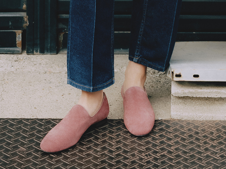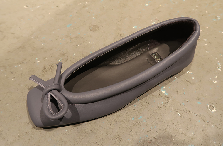 シープスキンのバレエシューズ(税抜き2万9000円)は、緩やかなスクエアトウで履き口をパッデッドで造形的に見せた。足をすっぽりと包み込んで足先も柔らか。熟練の技が詰まっているのは、スマートな曲線のスリッポン(3万円)だ。キップのベロアを使い、かかとのみを縫い合わせ、深履きのカットで品良く見せる。足の形にフィットし、かかとの作りもソフトに調整している。