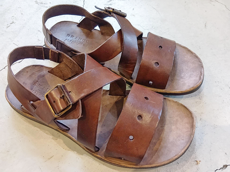 老舗ファクトリーブランド、ブラドールとの協業では、旧フランス軍のレザーサンダルから着想を得たパンチングデザインで、クラシックな軍用ディテールを踏襲しながら、現代的なフォルムに進化させたダブルネームの限定モデルを出す。ベジタブルタンニンなめしのナチュラルレザーに独自のストーンウォッシュ加工をしたサンダルは職人の手仕事で作られる。一足ごとにビンテージ感のある異なる表情で履き込むほどに風合いが増す。税抜き2万5000円。同じ素材でグルカサンダルタイプ(2万7000円)もある。女性4サイズ、男性6サイズ。