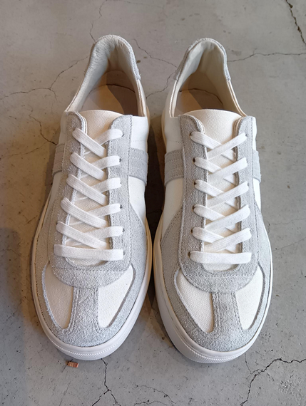 26年春夏物ではジャーマンアーミートレーナーに日本製帆布とベロアレザーのコンビ(2万3000円)も加えた。今後バルカナイズド製法によるハイスペックラインも企画する予定。