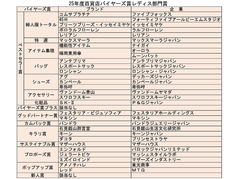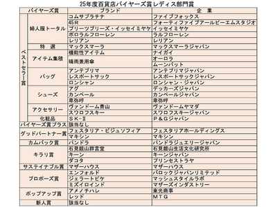 繊研新聞社が主催する25年度百貨店バイヤーズ賞レディスの部門賞が決まった。25年春夏と秋冬の結果をもとに、全国の百貨店バイヤーから推薦の多かった各部門で30のブランド及びカテゴリーを選出した。