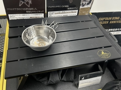 周年の限定商品は人気のシェラカップ、折り畳みテーブル、たき火台などを黒、金といった高級感のある色で打ち出す。「シチズン」と組んだ腕時計、『ゆるキャン△』との協業Tシャツなどもある。