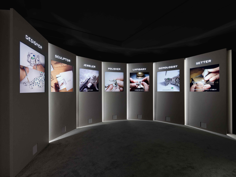 1914年に登場したパンテールの歴史、アイコンとして昇華させたクリエイティブディレクターのジャンヌ・トゥーサンのパーソナリティー、その造形美を作り出すサヴォワールフェール(匠の技)などを多彩な演出で体感できる。