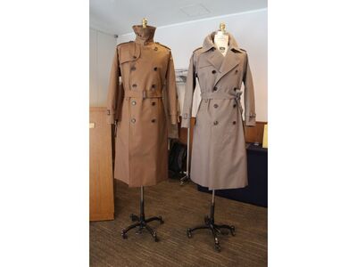 カルーゾの担当者が高く評価したのは、日本製の綿100%ギャバジンを使い、青森のコート専門の自社工場で縫製したサンヨーコートの「100年コート」シリーズのダブルのトレンチコート。肩から裾にかけてゆがみやよどみがなく、整然と生地が落ちるようなシルエットを理想に掲げた縫製は、真っすぐ縫うだけのように見える部分に〝引き縫い〟という技術を駆使。コートの顔ともいえる襟部分は、内側はカーブに合わせて手作業のまつり縫いにするなど随所に見られる熟練職人の技が注目された。協業品はJクオリティーのプロジェクトのメンバーでもあった内田染工場が深みのある中間色に染色した。