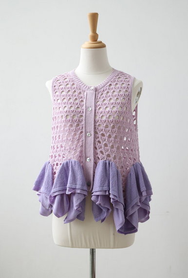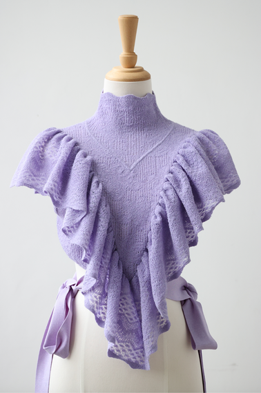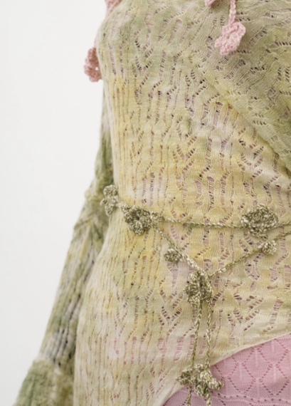 エアリーなジャカードニットやレース調のオープン構造に、透明モノフィラメントをアクセントとして加え、身体の動きに優雅に寄り添うレイヤード状の透かしテクスチャーを形成。エレガンスと透け感のバランスを巧みに表現。