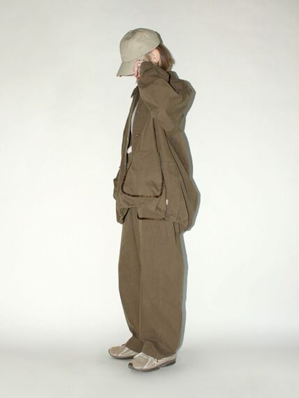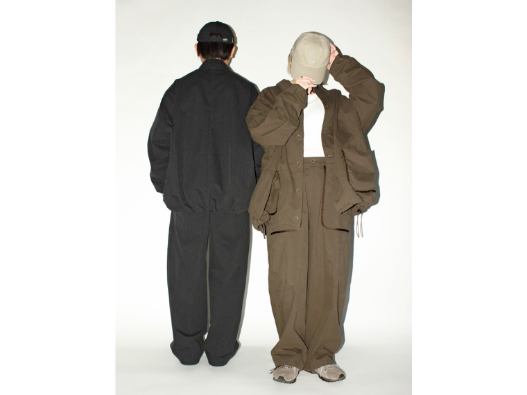 代表アイテムは、微起毛した綿・ナイロン地を使ったパンツとコーチジャケット。どちらも、ポケットの一部にアクセントとして同系色で少し光沢感のあるパイピングを採用する。バイオ加工でビンテージ風の表情も盛り込む。パンツはルーズシルエットでウエスト部分にゴムを採用し、税抜き2万9000円。ジャケットは3万2000円。黒と茶の2色展開で、セットアップの着こなしもお薦めだ。