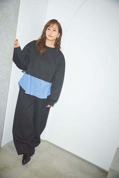 家庭で洗えるボンディング生地を使ったドレスとカーディガンのセットを作った。ドレスは裾や袖口を絞ることでシルエットを調整できる。藤本さんは「年齢を重ねるとシンプルなスウェットシャツだけでは物足りなさを感じるようになった。どこかにデザインのアクセントが欲しい」という。スウェットシャツは裾からストライプシャツをのぞかせたレイヤード風で、共地のワイドパンツとセット。
