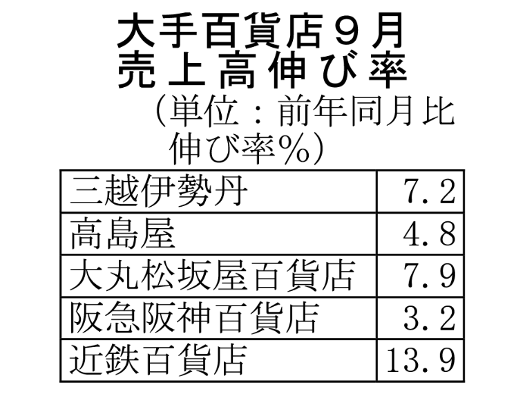 大手百貨店の9月売上高(既存店ベース、速報値)は全社が前年同月実績を上回った。国内客売り上げが堅調で、外商など組織顧客の買い上げが伸びた。免税売上高は伸び率が鈍化した前年実績を上回ったが、回復までに至らなかった。