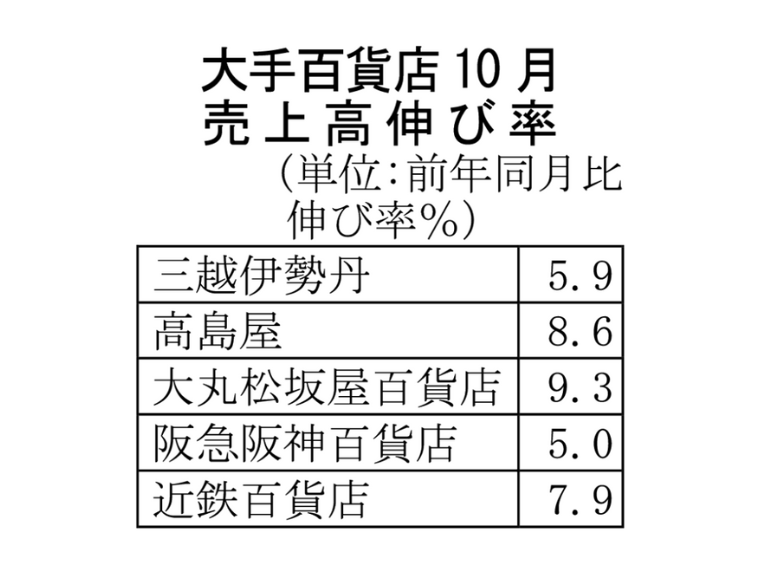 大手百貨店の10月売上高(既存店ベース、速報値)は全社が前年同月実績を上回った。国内客売り上げが堅調だったことに加え、インバウンド需要が増加した。後半からの気温低下で防寒アイテムが押し上げた。