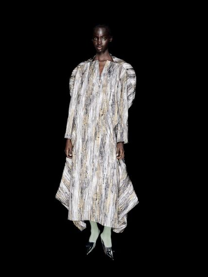 レディス「ディウカ」(田中崇順)は26~27年秋冬、得意の立体裁断による彫刻的なフォルムや3D効果のある素材でボリュームたっぷりの服を作った。オレンジやミントグリーン、ブルー、ゴールドなど様々な色も取り入れ、パワフルなコレクションになった。