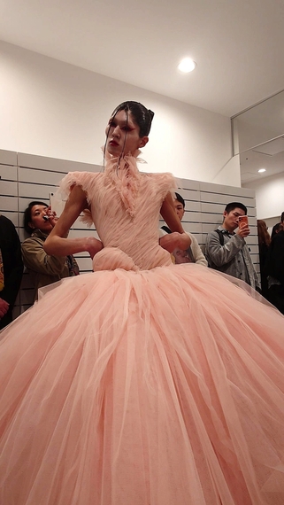 「マティエール・フェカル」のトランクショーでは、パリで発表した26年春夏コレクションの一部を新たな演出で見せた。会場はDSMGとブランドのSNSで予定を知って来た客でいっぱい。舞踏カンパニー、大駱駝艦のダンサーのパフォーマンスに続き、個性的なモデルが登場。構築的なドレスを見せた。