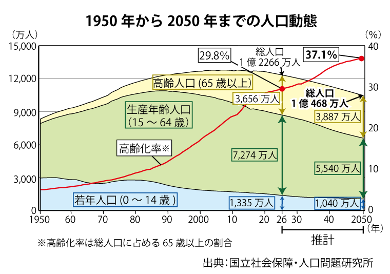 将来を考える際のマイルストーンとして、2050年を設定した。日本の人口が1億人を下回る可能性がある年で、温室効果ガス排出ゼロを目指す年でもある。国立社会保障・人口問題研究所が23年に発表した「日本の将来推計人口」によると、50年には1億468万人、65歳以上の割合(高齢化率)は実に37%にも上る。社会構造が変化する中で、どのような課題に向き合い、またどこにチャンスがあるのか。識者の視点からキーワードが浮かび上がってきた。