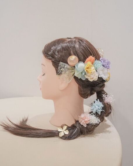 ハンドメイド作家として活動していた中谷さんは「髪飾りにこだわりたい」という声から、19年にオンラインで髪飾りの制作オーダーを開始した。やり取りを重ねる中で「1パーツ違うだけで印象が変わる」ことを痛感。色や配置の微妙な差は画面越しでは伝えきれない。そこで完成品販売ではなく、スタッフがアドバイスする形となった。
