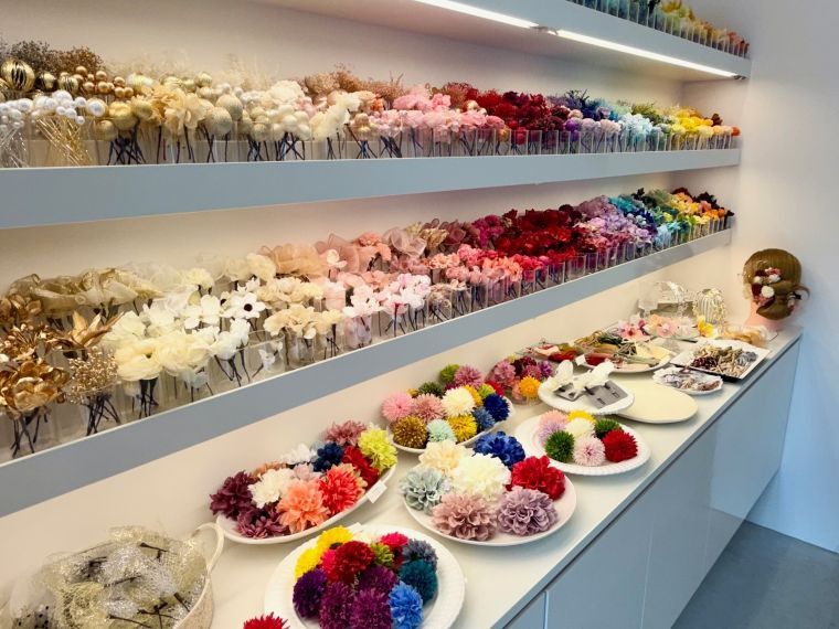 イベントでの体験型販売は好評だったものの、コロナ禍で中止が相次ぐ。「場所がないなら自分でつくろう」と、21年に高槻市でドライフラワー雑貨の実店舗を開いた。その後、SNSを中心に髪飾りの人気が広がり、遠方からの来客も増加。需要の拡大を受け、24年11月に髪飾り専門店を設けた。