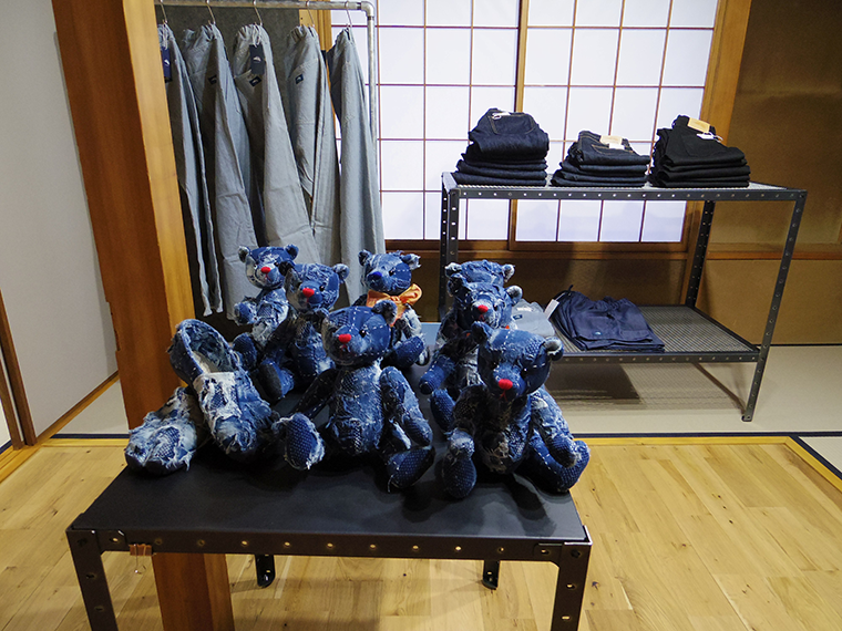 同店をハブとし、フーヴァルの加工技術を生かす形で、異業種との協業も推進していく。すでに、足袋メーカーの丸五(倉敷市)と協業した足袋シューズ、倉敷市のテディベア作家と協力したデニムのテディベアを1階で展示・販売している。デニムや刺し子、ユーズド加工を生かし、個性の光る仕上がりになっている。