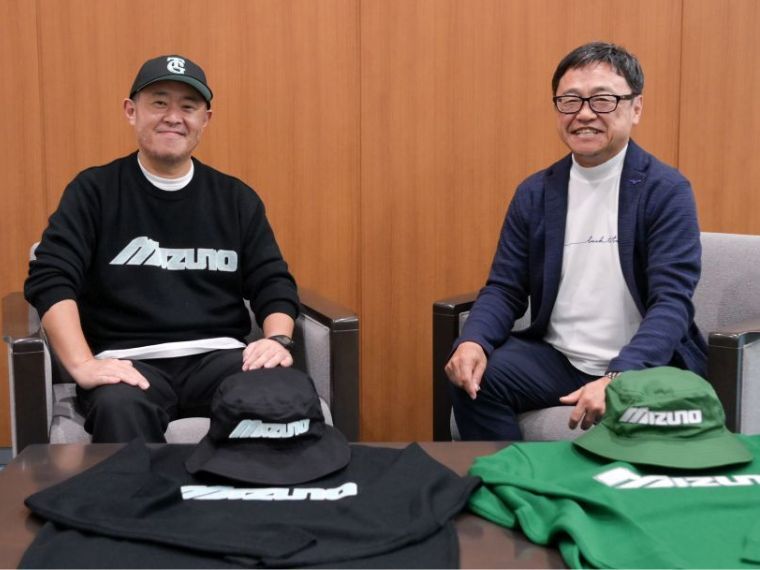 「ミズノ」の旧ロゴ(ワードマーク)を大胆に配したセーターやバケットハット…。年配者には懐かしく、若い人には新鮮に映るこの商品は、ミズノが「ニューヴィンテージゴルフ」(以下NVG)のために作った別注品だ。仕掛けたのは「ビームスゴルフ」の元ディレクター西脇哲さん。大手メーカーと組むことで、どんな化学反応が起きたのか。ミズノのゴルフ事業を統括する藤原誠さんと語り合った。