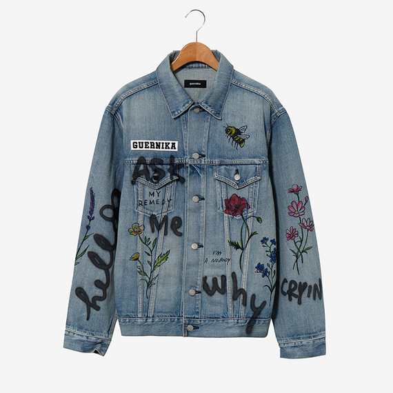12年に立ち上げたゲルニカは、メッセージのある落書きのようなペイントをバッグや服に施すなど、アートとファッションの垣根を超えた提案を目指している。「最初は古着をリメイクする形からスタートしたが、今は8割が新品で、国産ジーンズなどもある」。卸先に感度の高いセレクト店約20店を持つ。