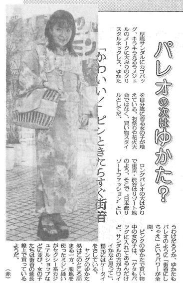 ゆかたが街着で大ヒットしたのです。この後に掲載した売れ行きをまとめた記事には、「不本意ですが、この夏の一番のヒット商品はゆかただった」というメーカーのコメントがあります。