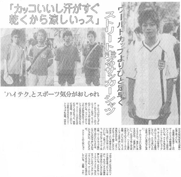ヨーロッパのナショナルチームやクラブチームのユニフォームなど、サッカーのゲームシャツが人気を集めている。コットンTシャツの上に派手色のサッカーシャツを重ねた男の子たちが、ストリートでやたら目に付くようになった。原宿には各国、各チームのシャツを取り揃えたストリートショップも出現。中学生から年配の男性までが熱心に見て買っている。