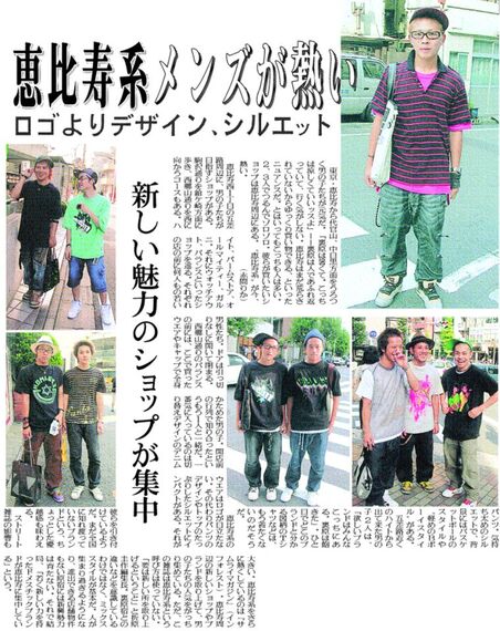 東京・恵比寿から代官山、中目黒方面をうろつく男の子たちが元気だ。「裏原は暑くて。こっちは涼しくていいッスよ」――裏原は人であふれ返っていて、行く気がしない。恵比寿はまだ荒らされていないからゆっくり買い物できる、といったニュアンスだ。とはいってもこっちも人は多い。2、3人でつるんでゾロゾロ。彼らが買いたいショップは恵比寿周辺にある。〝恵比寿系〟が今、熱い。