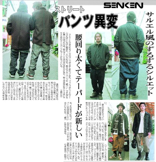 ストリートで見られるメンズのパンツが大きく変わってきた。ファイブポケットのジーンズにはいいかげん飽きた、というわけだ。極太のドカンパンツを〝腰パン〟でずるずるにはくのは当たり前。股のポイントが膝のあたりにあり、股上が非常に長くて大きいサルエル形のデニムパンツもブームになっている。