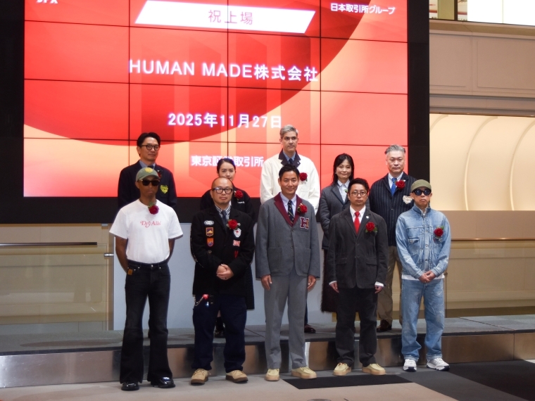 ヒューマンメイドは11月27日、東証グロース市場への新規上場を記念したセレモニーを開いた。クリエイティブディレクターのNIGO氏が10年に立ち上げたライフスタイルブランド「ヒューマンメイド」を中心に、飲食事業や保有IP(知的財産)のライセンスアウトなども行う。
