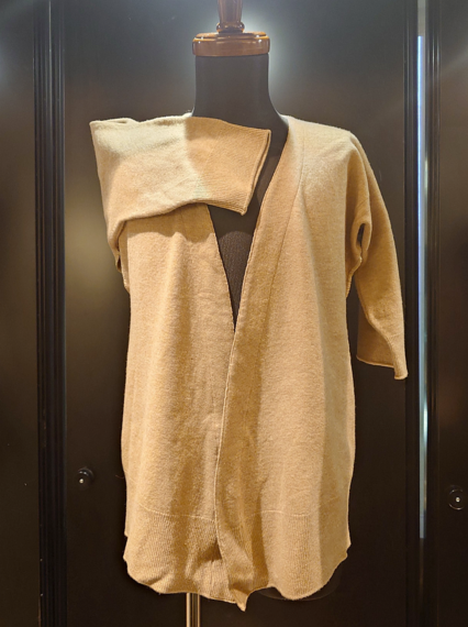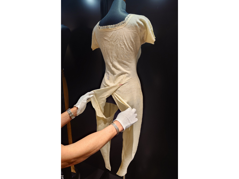 会場には1890年代の男性用アンダーパンツ、1900年代の女性用コンビネーションなどの下着、1930年代のウール製水着など、ファッションの変遷とともに製造されたアイテムが並ぶ。日本との交流は深く、皇室向けに365枚を納品したと関係者が伝えた1916年製のビキューナ製ロングジョンもある。スミスさんが注目するのは、来日前に見つけた、日本向けと書かれた古い箱から出てきた1900年頃に製造されたウール製肌着。袖の付いたボタンのないカーディガン仕様で脇の部分が開いており、きものの下に着用したのではないかという。