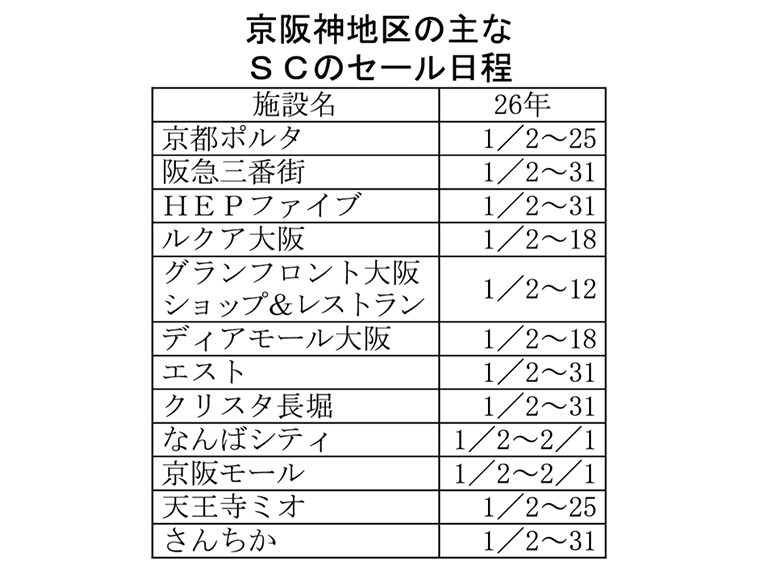 京阪神地区の主要SCの今冬のセールは、例年通り1月2日から開始する。期間もほぼ前年同様だ。かるた大会や抽選会など値下げ以外の集客企画にも取り組むSCが増えている。