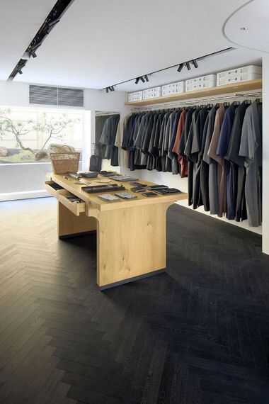 新店は細い裏通りに面した路面店で、売り場面積は73平方メートル。四つの四角い小部屋に分かれており、通りからガラス越しに中が見える部屋では、英国のテーラーをイメージして反物と帽子や傘を販売。奥の一部屋には仕立て上がりや羽織、アパレルブランド「グラフペーパー」などと協業したコートと、スタイリング用のシャツやマフラー、革小物、草履やレザーサンダルが並ぶ。奥の部屋からはガラス越しに中庭が見える。ゆったりとした空間でパーソナルな接客を行う。