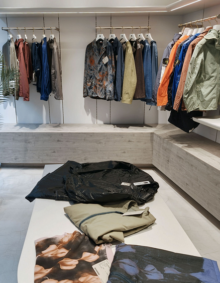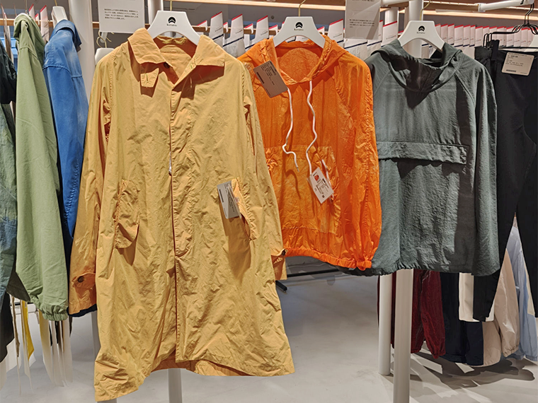 製品染めは染色前の白生地を縫製し、製品段階で染めるもの。同社は単に着色するだけでなく、パッカリングによるアタリやしわ、色の深みや立体感を表現する手法など、生機の選定と晒技術、多彩な後加工技術を組み合わせて様々な表情を付与できるのが強み。