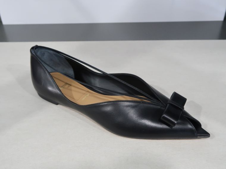 繊細なパンプスに定評のある「ヘンリエンヴァーゴ」は、甲の部分を曲線のV字にカットしたバックスリングサンダル、アッパーをプリーツ仕立てにしたミュールなど、シンプルながらも職人技の光る製品が揃う。トレンドアイテムでもあるポインテッドシルエットのオープントウパンプスも柔らかな曲線を強調し、ディテールをしっかりと作り込む。リボン装飾にストリングスを添え、きりりとした表情に仕上げた。