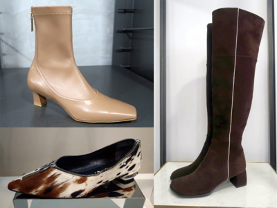 とりわけ目を引くのは、かかとから土踏まずのシェイプラインを強調したミドル丈ヒールのブーツだ。