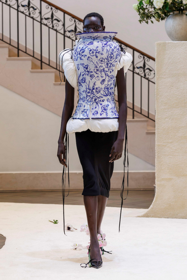 期待を一身に受けたショーは、アートとファッションのはざまを美しく切り取ってインパクトを残した。会場に置かれたのは花を生けたいくつかの壺(つぼ)。その間を縫うように登場したのが、セラミックの服だ。セラミックのパーツで構築したり、白磁の大きな壺に体を滑り込ませたり。柔らかい体と硬い磁器は全く違う質感だが、有機的な曲線がしっくりとなじむ。セラミック特有の立体的なフォルムをニットや縮絨(しゅくじゅう)ウールで表現したものもある。