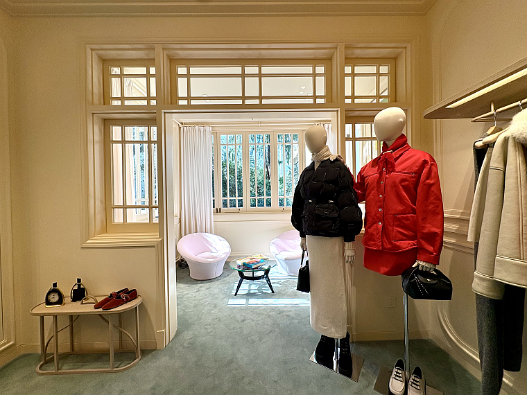 店舗に変えた邸宅は、ロンシャンの創業と同じ1948年の建築。地上2階、総面積150平方メートルの空間で、本物の家のようなリビングルーム、キッチン兼ダイニングルーム、ドレッシングルームなどを表現。