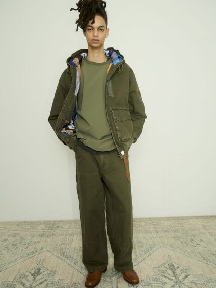 ミリタリーのディテールを取り入れたフーディーとワークパンツのセットアップ。裏地のオリジナルストライプが映える