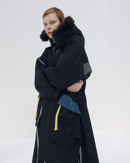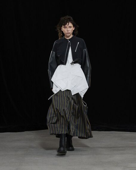 代表的なディテールは、プリーツやタック、カラーブロッキングなど。メインでは、このデザインを打ち出したデビューコレクション10型を復刻販売する。ライダーズジャケットを異素材ドッキングでショート丈にしたり、段ボールニットのトップをドレスにしたり、ベースはそのままに現代風にアップデートした。このほか、様々な生地を折りたたんで裾に重ねたシャツやN-3B風のマウンテンコートなど、初期のデザインをほうふつとさせるアイテムが充実する。