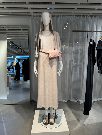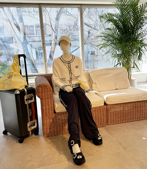 大人向けでエレガントなウェアが得意な「セルフォード」は、ラメ糸を混ぜたフーディーとスウェットパンツのセットアップを企画した。「ミースロエ」はカジュアルになりすぎないよう、コットン・ナイロン混のオフショルダートップと共地のドレープスカートを揃える。キャリーバッグに固定しやすいベルト付きボストンバッグがある。