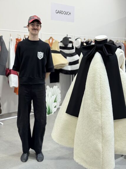 もう1組の注目ブランドは24年のイェールフェスティバルのファイナリストに選ばれたラ・カージュ。ブルゾンに使った素材は、地中で自然分解させるボロ加工が施されている。前シーズンはプレゼンを行ったが、26年秋冬は映像での発表を予定。