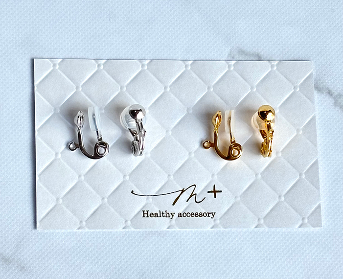 アレル配慮イヤリングパーツは真鍮(しんちゅう)に22金やロジウムでメッキしている。ニッケルが基準値の10分の1以下で、様々な化学物質のアレルギー反応リスクを考慮し、素材すべてに成分検査を行う。