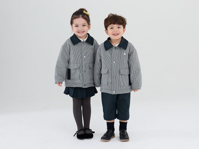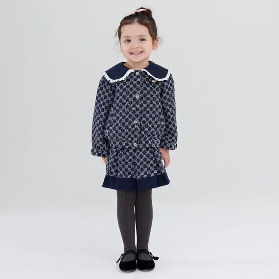 花柄のふくれジャカードのブルゾンとスカートのセットアップ(税込み2万9700円)やグレンチェックのジャンパースカート、ベストとハーフパンツのセットアップ、千鳥チェックの中わたコートとキュロットのセットアップなど。ネイビー、グレー、ブラックの落ち着いた色を基調とする。ブラックとゴールドのロゴの背タグや金属ロゴのプレートで特別感を出す。自宅で洗濯できる機能性も備えた。