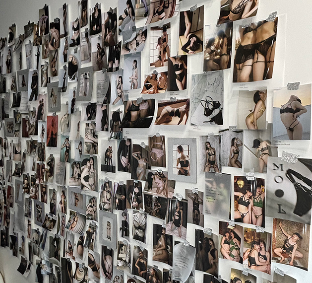 今回のインスタレーションは「これからのランジェリー体験」のプロローグと位置付け、あえて販売はせず、香りや映像、言葉を通じて感性を刺激する内容にした。壁一面に、これまでSNSを通じて発信してきたビジュアルを展示した。