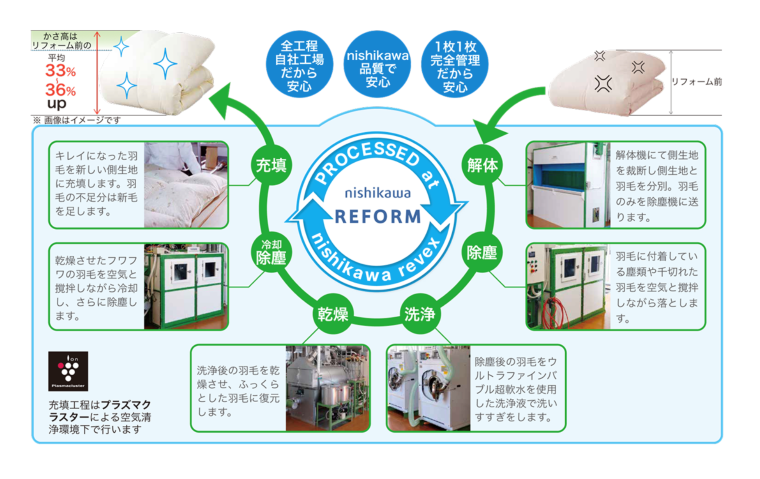 リフォーム工程の要は「洗浄」と「乾燥」です。nishikawaでは硬度ゼロに近い超軟水を用いて羽毛をやさしく洗い、さらに直径1マイクロメートル未満の「ウルトラファインバブル」で皮脂や臭いを徹底除去します。洗浄後は約120度の高温乾燥で羽毛をふっくらと立ち上げ、冷却過程で細かなゴミやホコリも取り除きます。工場内はプラズマクラスターによって清潔な空気環境を保ち、最後まで衛生的に仕立て直しが行われます。