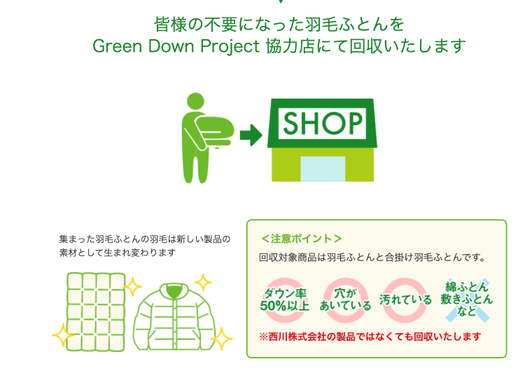 また、nishikawaは業界横断の「Green Down Project」にも参画しています。ここで回収された羽毛は多様な製品に再生されるだけでなく、リサイクルプロセスから生じる積立金の一部が災害支援や社会貢献活動に充てられます。羽毛を再利用することは、資源循環と社会貢献を同時に実現する取り組みです。