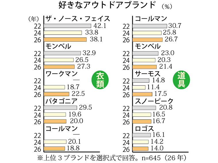 衣類で好きなアウトドアブランドは、「ザ・ノース・フェイス」(38.1%)、「モンベル」(27.3%)、「ワークマン」(22.5%)の順だった。道具は「コールマン」(26.7%)、「モンベル」(21.4%)、「サーモス」(17.5%)だった。