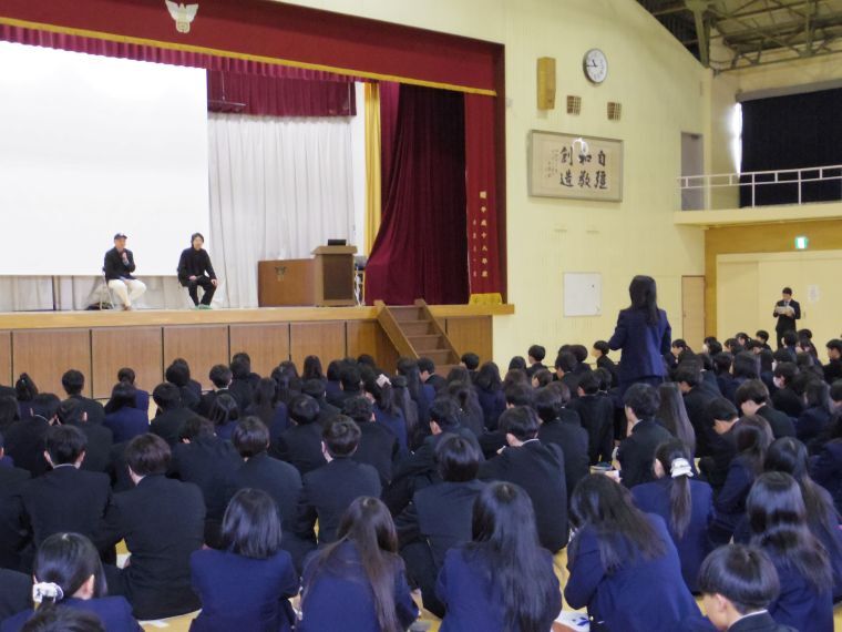 依頼したのは同校から。「生徒の身近な存在で、感性に響くものが企画できれば」(中澤隆志校長)と考え、全く接点のなかったパルにアプローチして実現した。96年から学校設定教科として「探究」をいち早く設け、生徒の主体的な学びを重視。その中で近年は社会人講座講演会も開催しており、今回が3回目の講演会になった。