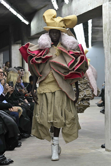 コムデギャルソンは素朴な風合いを全面に出したパワフルなコレクションを見せた。それはまるで大地の使いのようなナチュラルな力強さを秘める。ジュートやリネンを軸にし、しかも洗ってしわしわの風合いでできた不定形のフォルムだ。