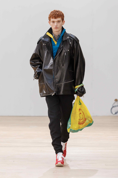 メゾンミハラヤスヒロはビッグサイズのレイヤードを軸にしたスタイル。ケーブルニットに編み込まれたクマのぬいぐるみなど、ユーモラスで楽しいアイテムもある。MA-1とスタジャン、Gジャンとキルティングブルゾンなど二つのアイテムを合体させたデザインをはじめ、このブランドの定番的な手法も目立つ。服はたいして変化していないが、ファーサンダルなど靴のアイデアはやはり面白い。